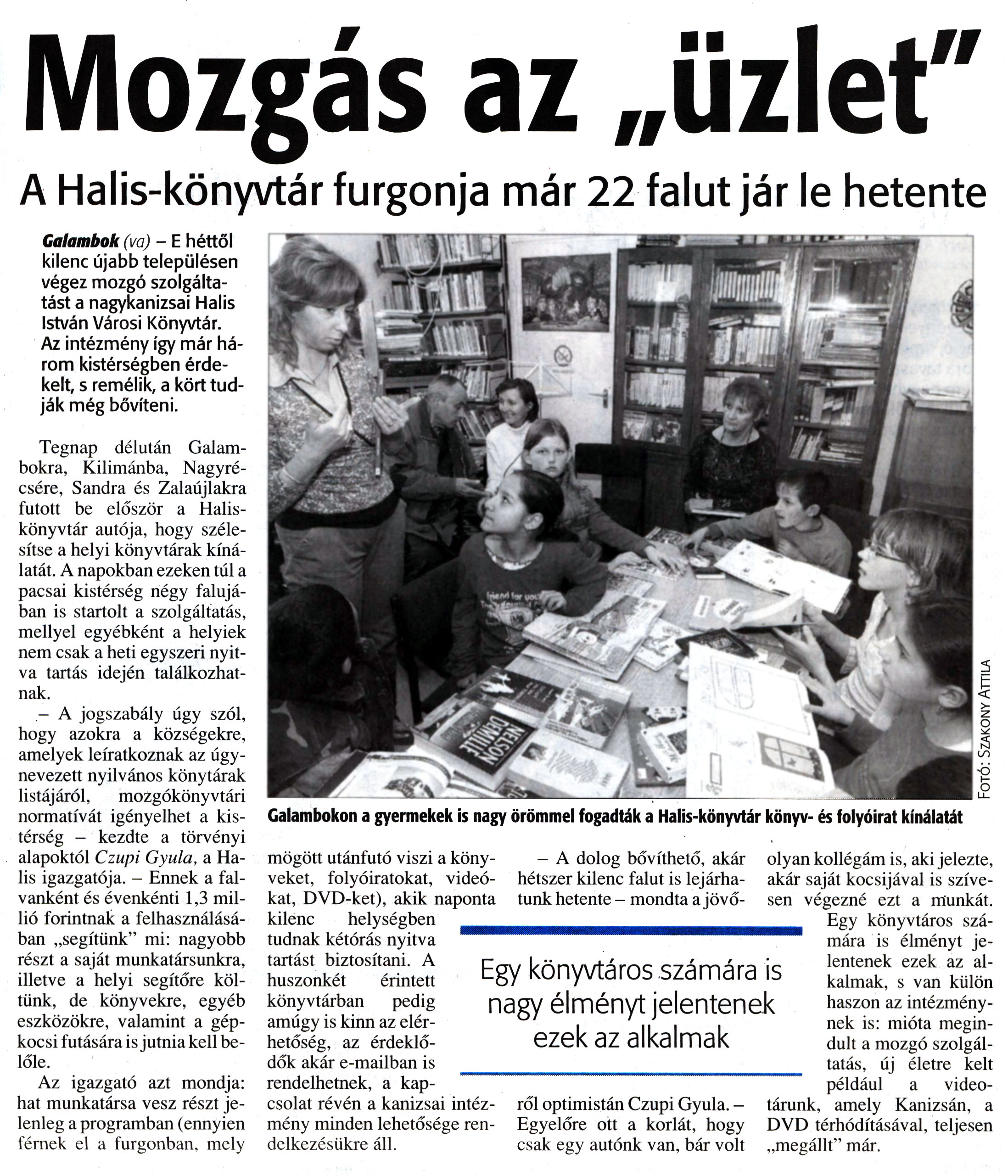 Nyilvános 7455 | 15052 | Zalai Hírlap 2008. március 14. 4. oldal - Mozgás az üzlet | Mozgás az „üzlet" A Halis-könyvtár furgonja már 22 falut jár le hetente Galambok (va) - E héttől kilenc újabb településen végez mozgó szolgáltatást a nagykanizsai Halis István Városi Könyvtár. Az intézmény így már három kistérségben érdekelt, s remélik, a kört tudják még bővíteni. Tegnap délután Galambokra, Kilimánba, Nagyrécsére, Sandra és Zalaújlakra futott be először a Halis-könyvtár autója, hogy szélesítse a helyi könyvtárak kínálatát. A napokban ezeken túl a pacsai kistérség négy falujában is startolt a szolgáltatás, mellyel egyébként a helyiek nem csak a heti egyszeri nyitva tartás idején találkozhatnak. - A jogszabály úgy szól, hogy azokra a községekre, amelyek leiratkoznak az úgynevezett nyilvános könytárak listájáról, mozgókönyvtári normatívát igényelhet a kistérség — kezdte a törvényi alapoktól Czupi Gyula, a Halis igazgatója. - Ennek a falvanként és évenkénti 1,3 millió forintnak a felhasználásában „segítünk" mi: nagyobb részt a saját munkatársunkra, illetve a helyi segítőre költünk, de könyvekre, egyéb eszközökre, valamint a gépkocsi futására is jutnia kell belőle. Az igazgató azt mondja: hat munkatársa vesz részt jelenleg a programban (ennyien férnek el a furgonban, mely mögött utánfutó viszi a könyveket, folyóiratokat, videókat, DVD-ket), akik naponta kilenc helységben tudnak kétórás nyitva tartást biztosítani. A huszonkét érintett könyvtárban pedig amúgy is kinn az elérhetőség, az érdeklődők akár e-mailban is rendelhetnek, a kapcsolat révén a kanizsai intézmény minden lehetősége rendelkezésükre áll. - A dolog bővíthető, akár hétszer kilenc falut is lejárhatunk hetente - mondta a jövőről optimistán Czupi Gyula. - Egyelőre ott a korlát, hogy csak egy autónk van, bár volt olyan kollégám is, aki jelezte, akár saját kocsijával is szívesen végezné ezt a munkát. Egy könyvtáros számára is élményt jelentenek ezek az alkalmak, s van külön haszon az intézménynek is: mióta megindult a mozgó szolgáltatás, új életre kelt például a video-tárunk, amely Kanizsán, a DVD térhódításával, teljesen „megállt" már. |